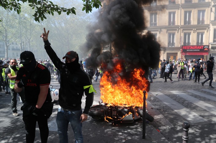 Несколько автомобилей и мопедов охвачены огнем на парижской улице, где днем в субботу, 20 апреля, проходит очередная акция протеста "желтых жилетов", передает Tengrinews.kz со ссылкой на РИА Новости.