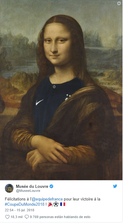 "Наши поздравления сборной Франции в честь их победы на чемпионате мира - 2018", - написала администрация музея в Twitter. Сообщение сопровождает изображение написанной Леонардо да Винчи Моны Лизы, которую с помощью графического редактора "переодели" в футбольную форму.