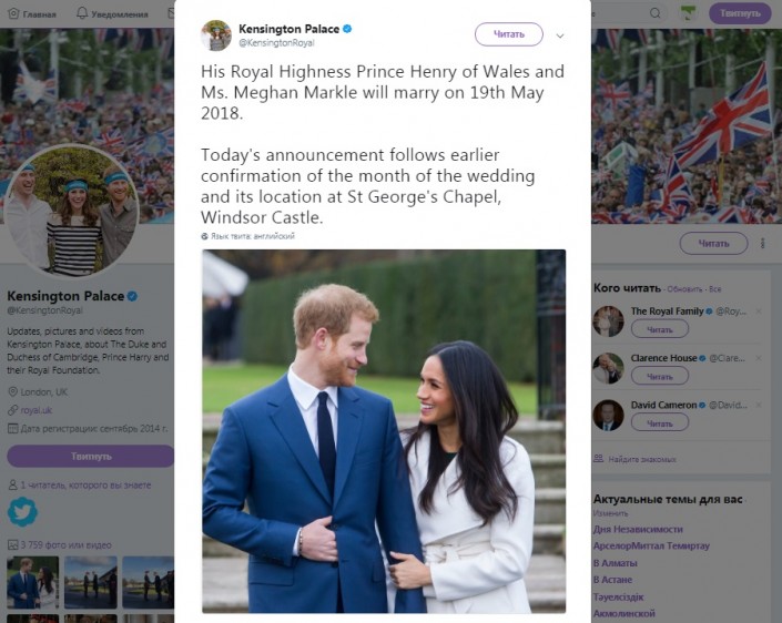 Свадьба британского принца Гарри и американской актрисы Меган Маркл состоится 19 мая 2018 года. Об этом сообщил на своей официальной странице в Twitter Кенсингтонский дворец, передает Tengrinews.kz.
