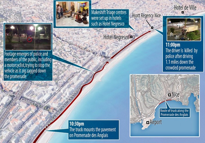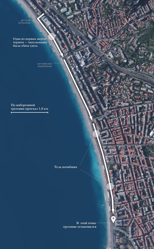 Напомним, вечером 14 июля, в День взятия Бастилии, на Английскую набережную в Ницце, заполненную людьми, выехал грузовик. Автомобиль врезался в толпу и проехал, двигаясь загзагами по набережной почти два километра. В результате погибли как минимум 84 человека, более 100 получили ранения. Как двигался грузовик по набережной, можно увидеть на приведенной ниже карте.