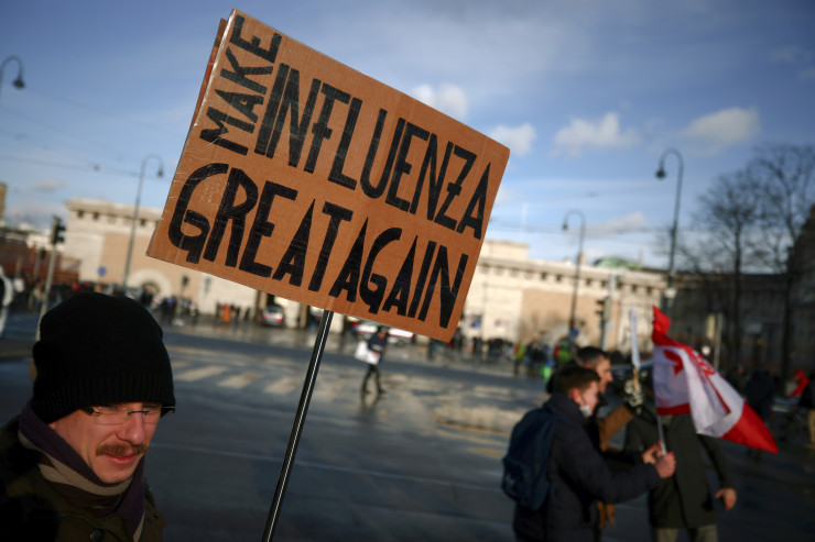 Скандирующие демонстранты - многие без масок - держали плакаты, в том числе Kurz Must Go ("Курц должен уйти)" и Make Influenza Great Again ("Сделаем грипп снова великим") во время маршей по центру города.