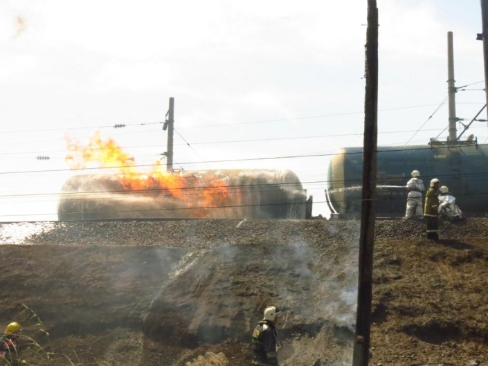 "Сегодня в 12.53 в Шымкенте на железнодорожной станции "Коргасын" произошло опрокидывание одной цистерны с ГСМ (емкость 60 тонн) грузового состава сообщением станция Бейнеу - станция Асса с последующим возгоранием. Рядом находилась еще одна цистерна с ГСМ такой же емкости, которую пожарные охлаждали, подавая воду, для предотвращения взрыва. На время работы огнеборцев сотрудниками полиции было эвакуировано 125 жителей из близ расположенных частных жилых домов", - сообщили в комитете.