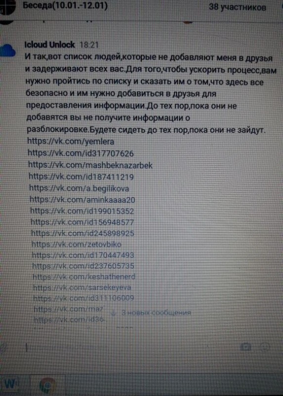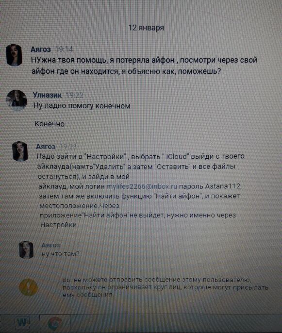 По его данным, злоумышленники взламывают аккаунты пользователей в "ВКонтакте" и рассылают сообщение списку друзей с просьбой войти на сторонний аккаунт iCloud, чтобы якобы найти его "пропавший" телефон. Затем смартфоны блокируются неизвестными. "Мошенники блокируют через свой айфон и требует деньги на киви-кошелек. Пока сумму не называли. Они создали беседу "ВКонтакте", там уже больше 30 человек, у кого заблокировались телефоны", - рассказал житель Алматы. Парень предупреждает других пользователей быть осторожными при таких просьбах "ВКонтакте", так как на эту уловку уже попалась его сестра.