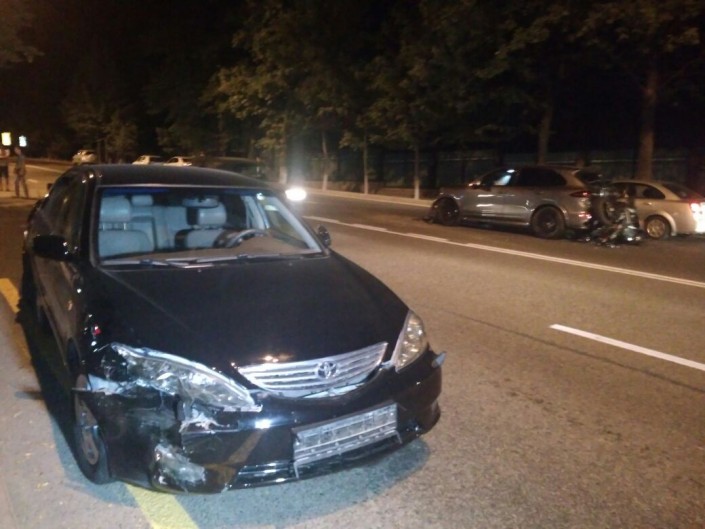 Водитель автомобиля Porsche Cayenne, не успев среагировать, ударил Toyota Camry, которая в этот момент пыталась то ли повернуть, то ли развернуться. От удара японскую иномарку развернуло и она задела следовавшую по дороге Mitsubishi Space Wagon. В это время в Cayenne въехал мотоциклист на Yamaha.