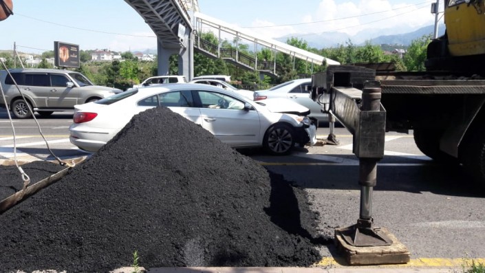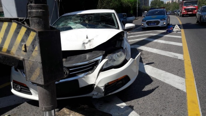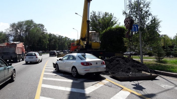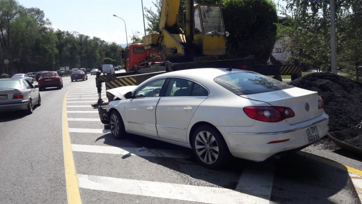 Водитель белого Volkswagen, двигаясь в западном направлении по проспекту Аль-Фараби, западнее улицы Ходжанова (ранее Водозаборная - авт.), по всей видимости, не заметил стоящий на дороге кран.