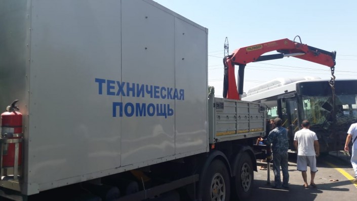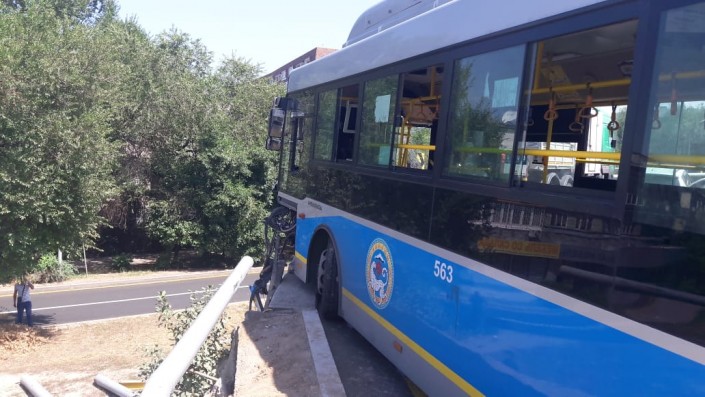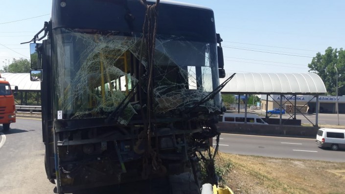 ДТП произошло на развязке на пересечении улицы Саина и проспекта Райымбек батыра. Автобус, маршрут которого неизвестен, ехал по Саина в северном направлении. Водитель не справился с управлением, автобус на полном ходу врезался в отбойник. В результате аварии пострадавших нет.