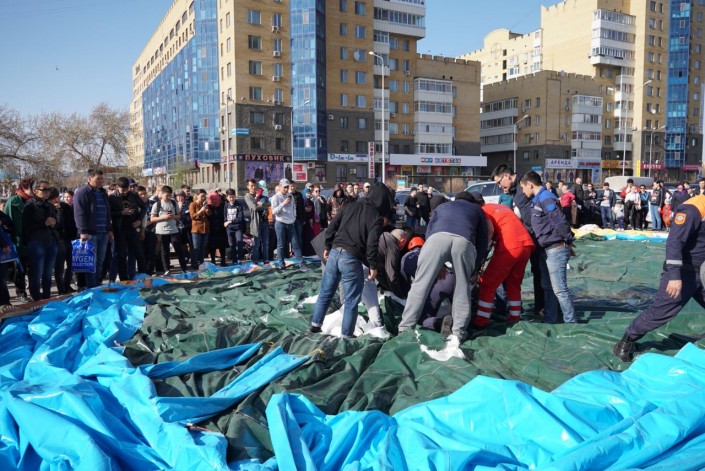 В земле остались металлические колья и оборванные веревки. По данным КЧС МВД РК, батут пролетел на расстояние около 20 метров от места закрепления.