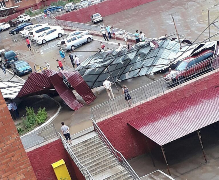 "Батыс 2. Сильный ветер вырвал с корнем стоянки и полетел в сторону дома, разбил машины и балконы жильцов", - пишет в Instagram @gorod_aktobe