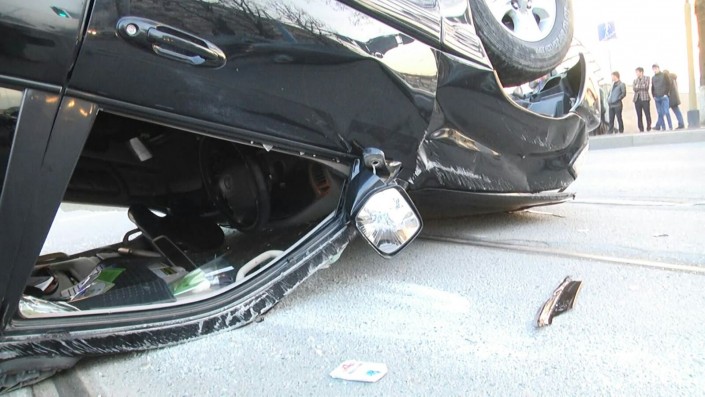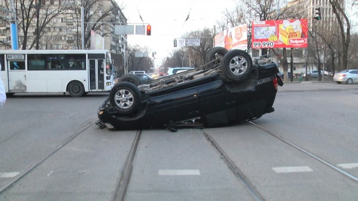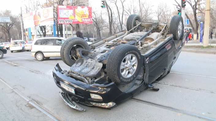 В центре Алматы опрокинулся на крышу внедорожник Toyota Land Cruiser