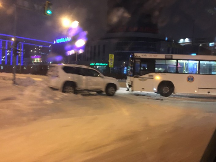 В центре Астаны внедорожник Toyota Land Cruiser Prado столкнулся с пассажирским автобусом, передает корреспондент Tengrinews.kz. ДТП произошло 17 января этого года.