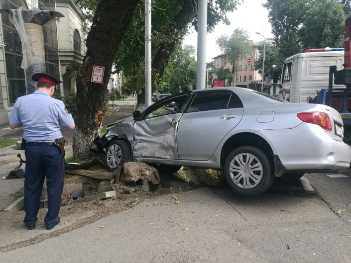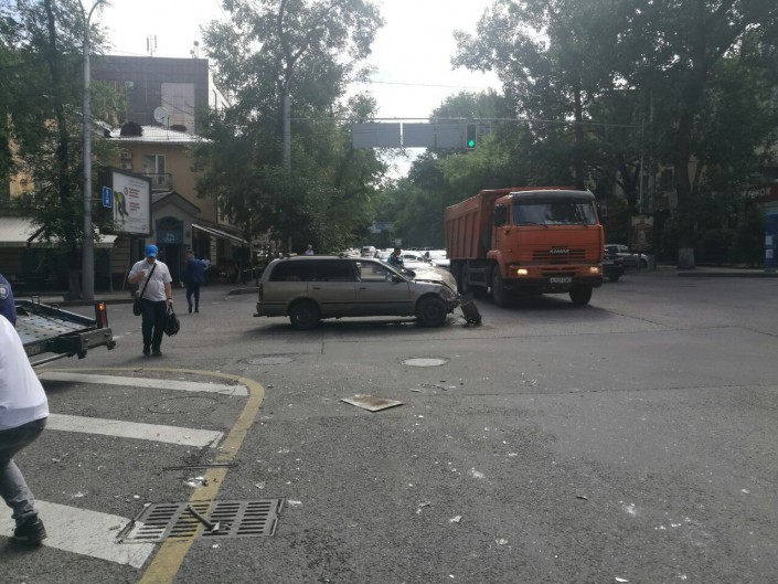 Со слов очевидцев, следуя по улице Курмангазы, Toyota на зеленый свет начала пересекать Желтоксан. В этот момент ей в бок врезался Nissan, который ехал вниз по односторонней улице. Toyota закрутило и отбросило на светофорный столб.