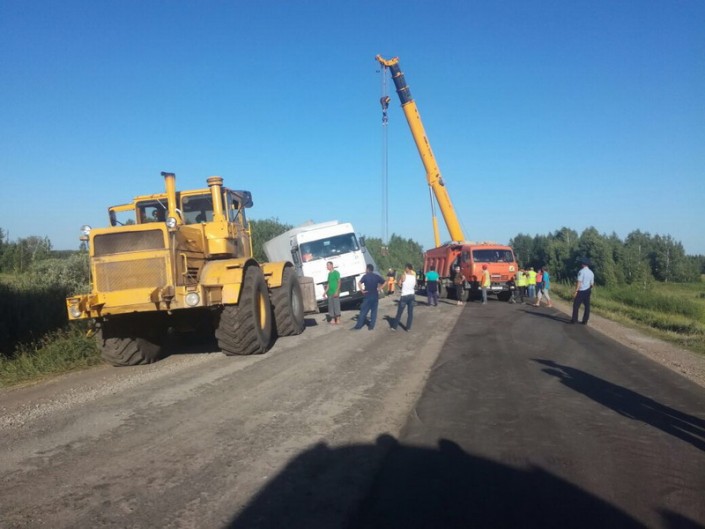 Фура "накренилась" и едва не завалилась в кювет. На этом участке идет ремонт дороги. Ограничение скорости - 40 километров в час. В процессе вызволения большегруза возникла пробка длиной в 5 километров.