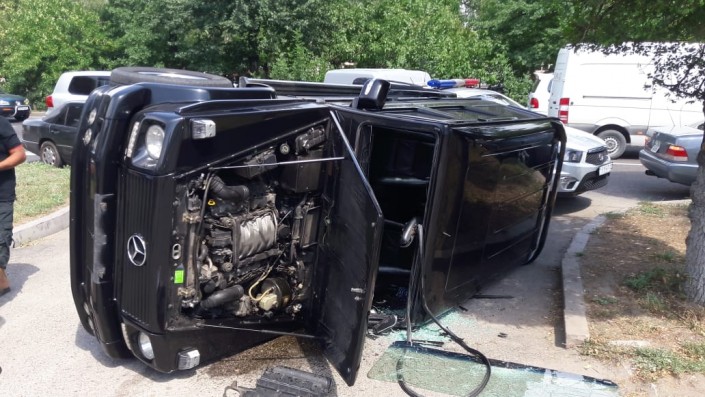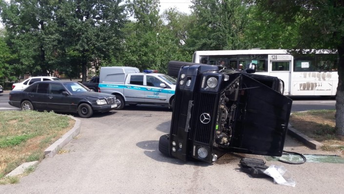 ДТП произошло по проспекту Абая между улицами Розыбакиева и Тургут Озала. По словам очевидцев, водитель Gelandewagen хотел повернуть направо перед улицей Розыбакиева. В это время по автобусной полосе ехал автомобиль марки Mercedes. Произошло столкновение двух авто, в результате которого Gelandewagen упал на бок.
