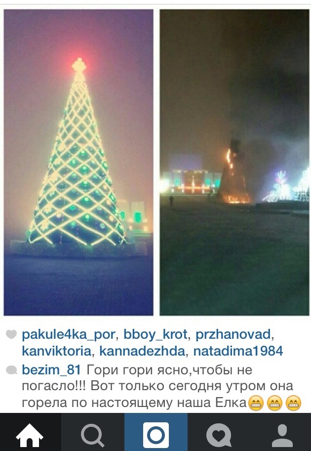 Главная новогодняя елка Кызылорды сгорела на центральной площади города, сообщает корреспондент Tengrinews.kz со ссылкой на ДЧС области.