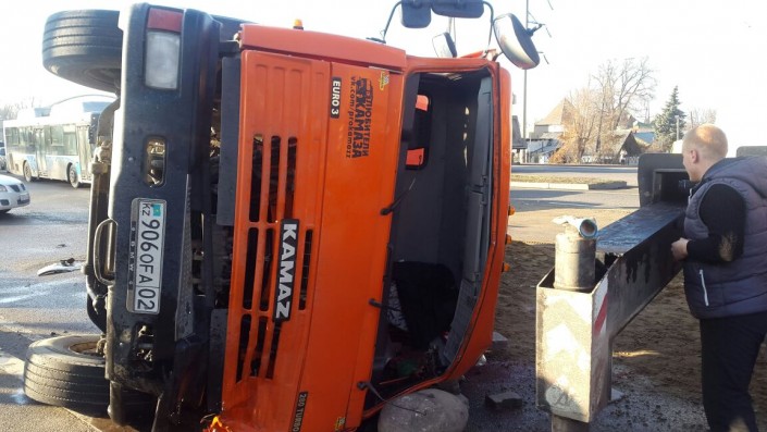 Груженый "КамАЗ" столкнулся с Lada и перевернулся в Алматы