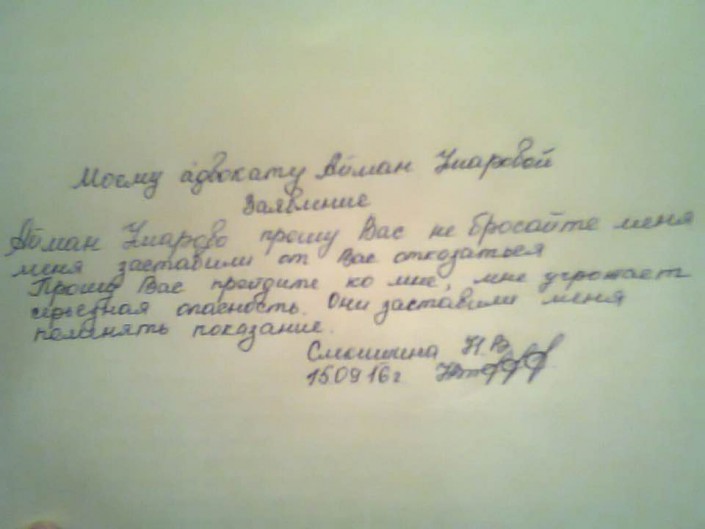 В заявлении Слекишина просит Умарову не бросать ее и поясняет, что ее заставили ранее отказаться от ее услуг. "Прошу Вас, пройдите ко мне, мне угрожает серьезная опасность. Они заставили меня поменять показания", - говорится в письме.