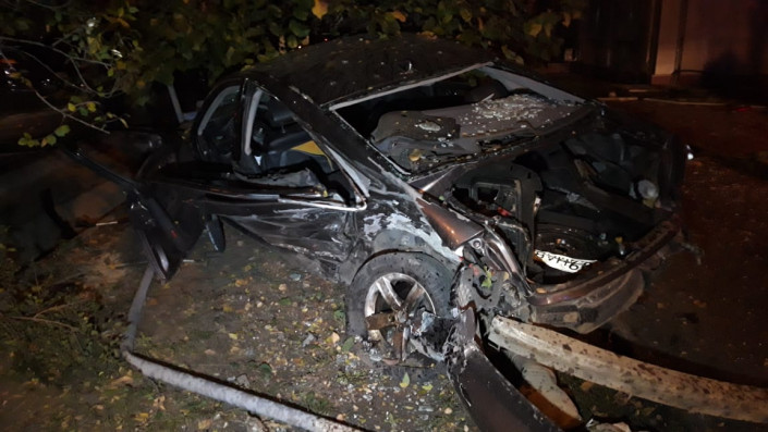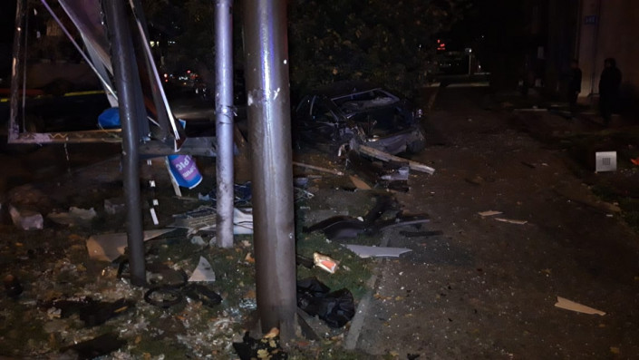 На полном ходу BMW врезался в Audi. От сильного удара Audi ударилась в рекламный щит и дерево. BMW дальше закрутило по дороге, он ударил Subaru Forester и Toyota Carina.