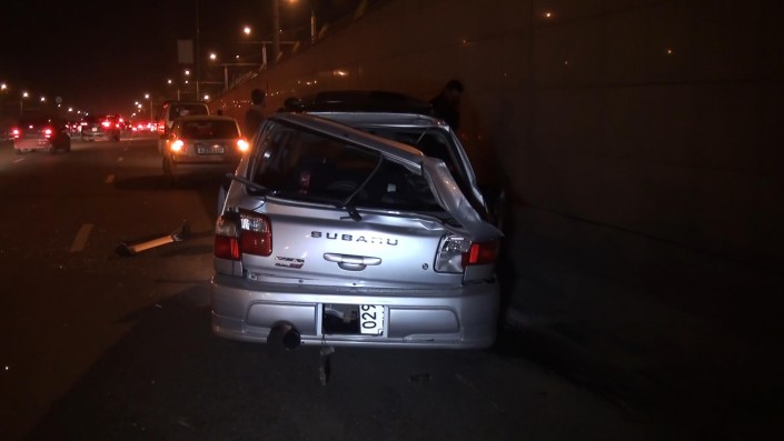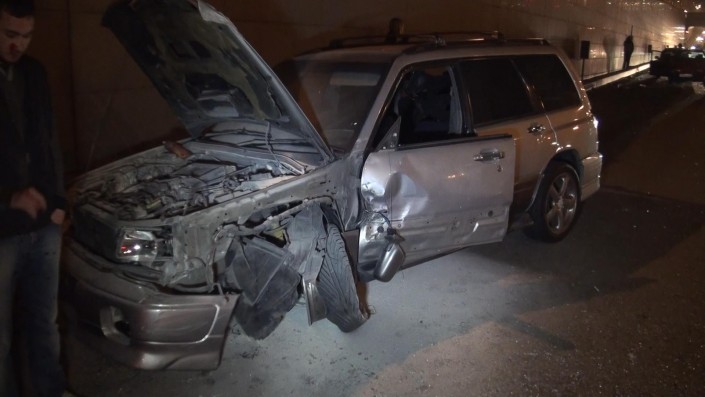 Буквально через 30 минут также на улице Саина из-за пробки, образовавшейся из-за предыдущей аварии, произошло еще одно ДТП. На север по Саина двигались автобус, Volkswagen Passat, Subaru Outback и Subaru Forester. По словам очевидцев, водители автобуса, Volkswagen Passat и Subaru Outback остановились из-за образовавшейся пробки, а водитель Subaru Forester не заметил ее и на высокой скорости, пытаясь избежать ДТП, взял правее и в итоге пролетел между Volkswagen и туннелем развязки, влетел в туннель и перевернулся. Volkswagen и Subaru Outback после удара врезались в автобус. В результате аварии пострадал пассажир Subaru Forester.