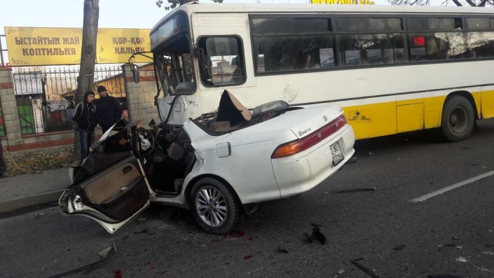 Водитель легкового автомобиля скончался после столкновения с автобусом в Алматы, сообщает корреспондент программы "Территория происшествий" на канале СТВ.
