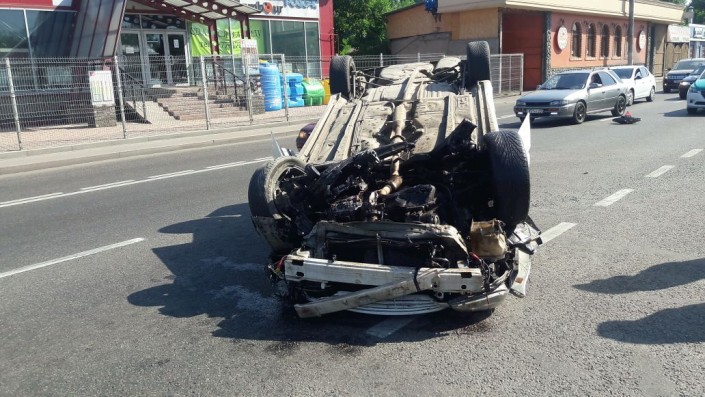 Lexus перевернулся от удара об бордюр в Алматы, передает корреспондент программы "Территория происшествий" на канале СТВ.