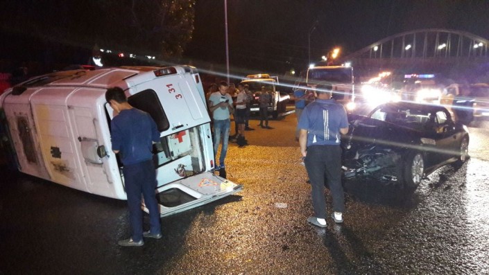 Машина скорой помощи перевернулась в результате ДТП в Алматы, передает корреспондент программы "Территория происшествий" на канале СТВ.