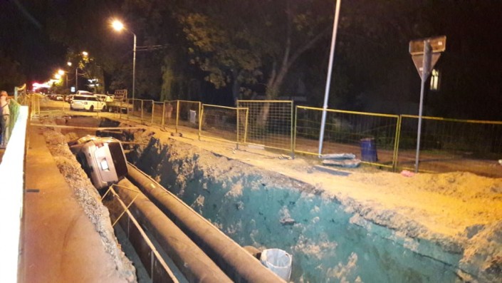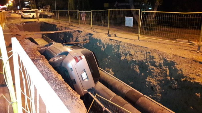 Водитель Mercedes провалился в траншею, где шли ремонтные работы, пытаясь избежать столкновения с подрезавшим его автомобилем, сообщает корреспондент программы "Территория происшествий" на телеканале СТВ.