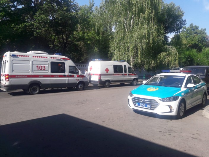 17.41. Центральная городская клиническая больница на Манаса, куда экстренно доставили фигуриста. Здесь также стоят полицейские машины. Здесь же находятся родные и близкие Дениса Тена.