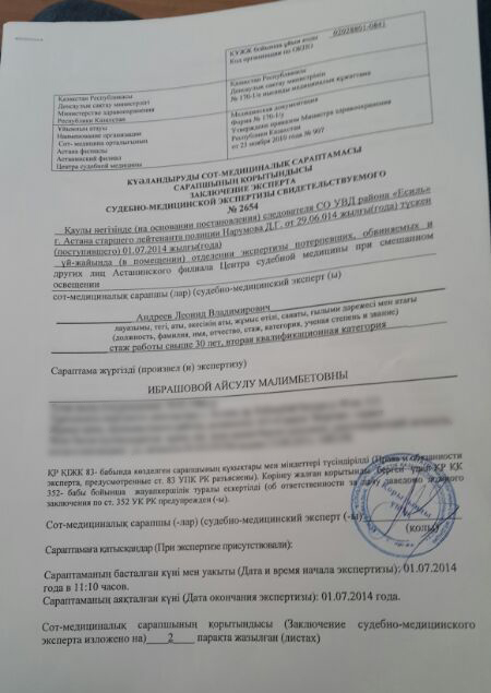 Жительнице Астаны Айсулу Ибрашовой передали результаты ее судебно-медицинской экспертизы по инциденту с участием олимпийского чемпиона по боксу Бахтияра Артаева, передает корреспондент Tengrinews.kz.