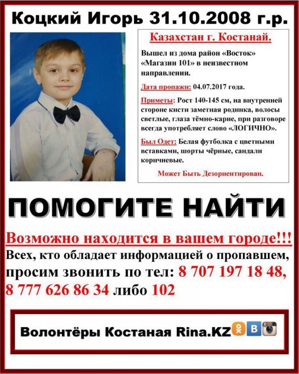 Шестые сутки в Костанае продолжаются поиски восьмилетнего Игоря Коцкого, сообщает alau.kz. Мальчик пропал 4 июля в районе магазина "Восток".