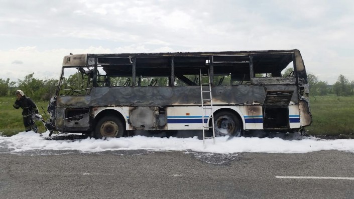 Сначала загорелся двигательный отсек, после чего огонь распространился на салон рейсового автобуса марки КАВЗ "Аврора". В салоне автобуса находилось 20 пассажиров, он следовал по маршруту Дружба - Кокшетау.
