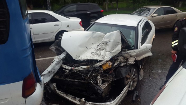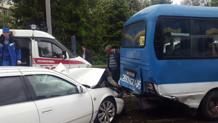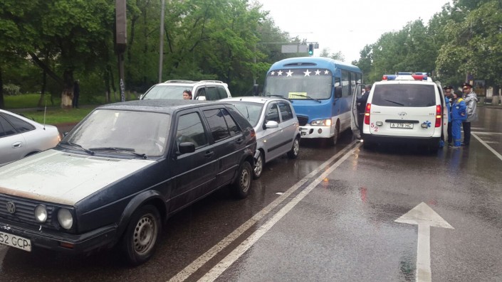 Дорожный инцидент произошел утром 2 мая на улице Жандосова близ проспекта Гагарина. Автомобили Volkswagen, Hyundai Getz и маршрутный автобус №336 стояли на светофоре на красный свет в восточном направлении. "В этот момент водитель Toyota Сamry, по всей видимости, не справился с управлением и на большой скорости врезался в маршрутный автобус. Тот в свою очередь отлетел на впереди стоящий Hyundai, а тот на Volkswagen", - сообщил корреспондент.