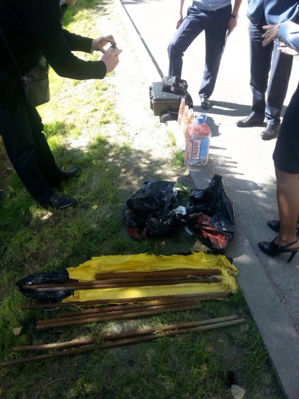 На опубликованных в соцсетях фото видно, что полицейские исследуют место оцепления. На асфальте лежат металлические прутья, которые, по всей видимости, было спрятаны в черные пакеты. Кроме этого, на фото видны куски ткани, а также несколько стеклянных бутылок и одна пластиковая емкость с жидкостью. На кадрах видно, что полицейские изучают предметы на наличие отпечатков пальцев.