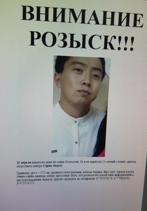 Как рассказала мама Акжола Гульнур Забиркызы, их семья несколько лет назад переехала из Китая. Сейчас молодой человек учится на филологическом факультете, подрабатывает в фармацевтической компании. 13 апреля студент должен был по работе отнести около 180 тысяч тенге своему начальнику. Тем же вечером его телефон перестал отвечать. Последний раз Акжола видели около ТД "Даниель".