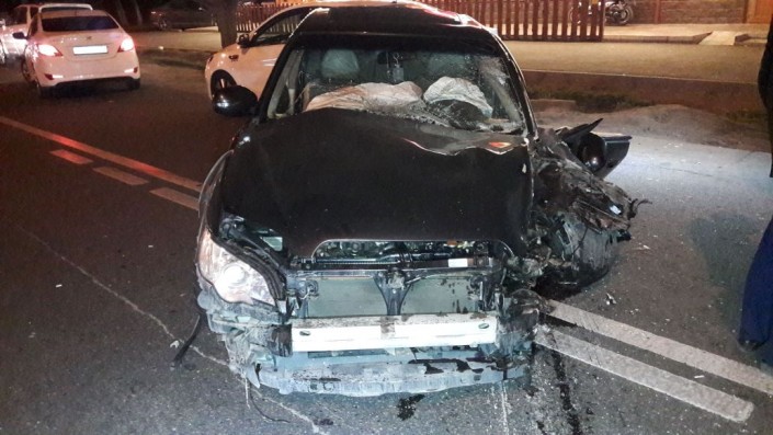 Авария произошла на пересечении улиц Толе би и Аносова. Со слов очевидцев, автомобили Subaru и Nissan двигались в восточном направлении по Толе би. По всей видимости, водитель Nissan решил повернуть на улицу Аносова и врезался в Subaru. Водитель Subaru не справился с управлением и на полном ходу влетел в бетонный столб, после чего его отбросило в припаркованную Kia.