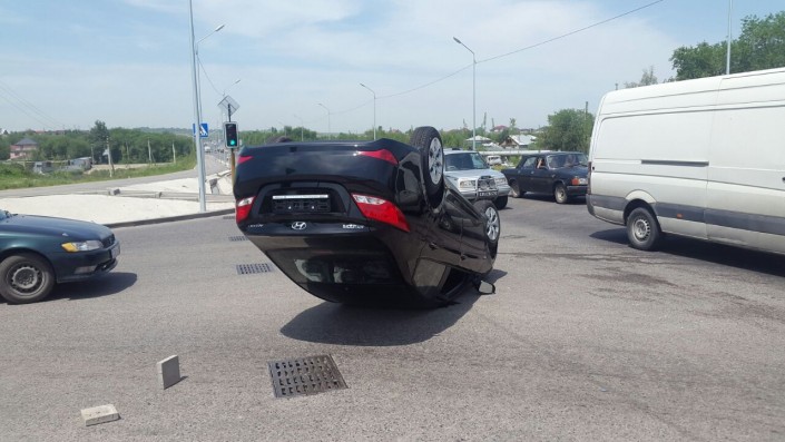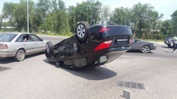 Автомобиль Hyundai перевернулся в результате ДТП в Алматы, передает корреспондент программы "Территория происшествий" на телеканале СТВ.