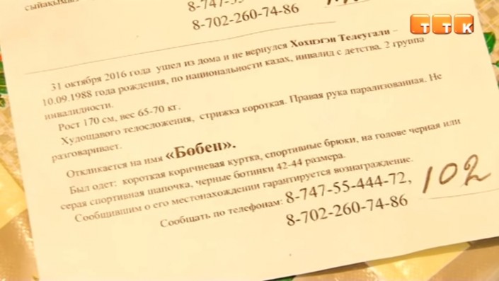 Обычно, говорит Аишхан, он любил прогуливаться по родному аулу, но в тот день домой не вернулся. Позже родным сообщили, что видели его в соседнем поселке. "На следующий день с Караганды приехали полицейские с собаками. Они искали по следам, которые привели их в аул Крестовка, он от нас в 10 километрах. В ауле даже нашлись люди, которые подтверждают, что видели его здесь, да и след собаки потеряли именно в этом ауле", - рассказала женщина.
