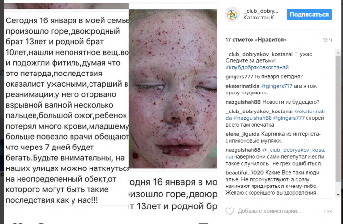 О произошедшем стало известно благодаря социальным сетям. "В моей семье произошло горе, двоюродный брат 13 лет и родной брат 10 лет нашли непонятное вещество и подожгли фитиль, думая, что это петарда. Последствия оказались ужасными – старший в реанимации, у него оторвало взрывной волной несколько пальцев, большой ожог, ребенок потерял много крови. Младшему больше повезло – врачи обещают, что через семь дней будет бегать", - пишут в группах в социальных сетях.