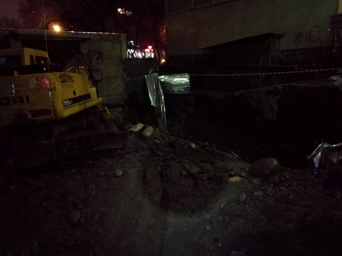 По словам жильцов дома, рядом с существующим зданием, где ранее якобы был прием стеклотары, начала производить пристройку одна предпринимательница, и сегодня вырыли котлован. В результате дождя к вечеру он начал обваливаться. В связи с этим около 40 жильцов вышли на улицу, они опасаются, что обвал грунта повлечет обрушение дома. "Тут страшно находиться, слышен грохот обваливающегося грунта. А рядом наш дом, страшно спать сегодня. Здесь и трех метров нет до жилого дома, а такая яма", - жалуются жильцы.