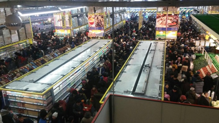 В Актобе местные жители устроили давку на открытии нового гипермаркета "Анвар" по проспекту Нокина. Кадры инцидента, который произошел в среду, 16 декабря, появились на странице zello_aktobe в Instagram.