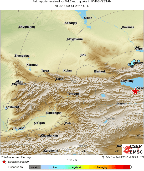 По данным Европейского-Средиземноморского сейсмологического центра, эпицентр землетрясения магнитудой 4,6 находился в 137 километрах на юг от Алматы на территории Кыргызстана.
