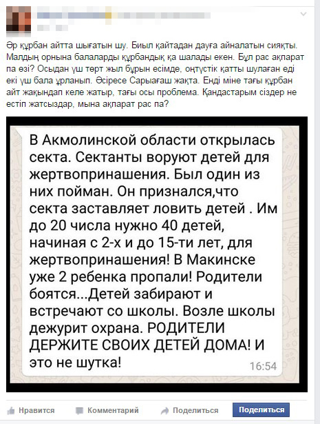 Напомним, в начале сентября в полицию обратились две жительницы Акмолинской области. Они заявляли, что неизвестные лица пытались похитить их детей. В ходе проверки данные факты не подтвердились. Несовершеннолетние выдумали историю, так как опоздали на уроки в школу. Эти сведения стали поводом для распространения в социальных сетях "Одноклассники" и мобильном мессенджере WhatsApp ложной информации. В ней говорилось, что на территории области якобы действует секта, занимающаяся похищением детей от двух до пятнадцати лет.