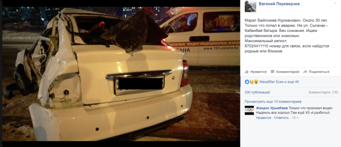 "Марат Байгозиев Нурманович. Только что попал в аварию. На ул. Сыганак - Кабанбай батыра. Без сознания. Ищем родственников или знакомых.  87024411110 номер для связи, если найдутся родные или близкие", - написал в соцсети Евгений Переверзев.