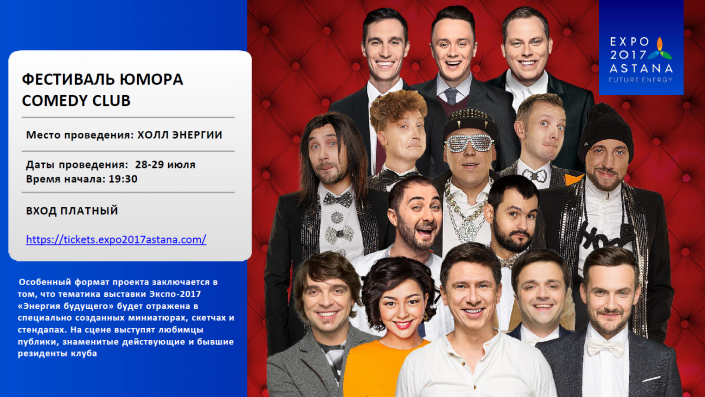 В культурной программе указаны шоу, на которые можно попасть с билетами EXPO, а также мероприятия, на которые нужно приобретать билеты отдельно. Посещение EXPO-2017 в фиксированный будний день обойдется в четыре тысячи тенге, в выходной - шесть тысяч. Билеты без фиксированной даты стоят восемь тысяч тенге.