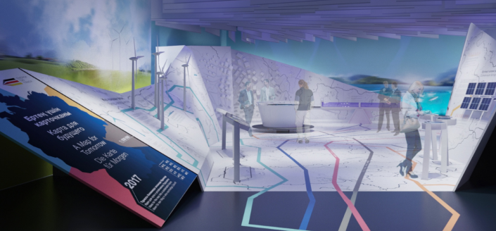 Дорога к центру павильона пройдет по "карте будущего", где будут демонстрироваться основные способы получения возобновляемой энергии как уже существующие, так и находящиеся в разработке.