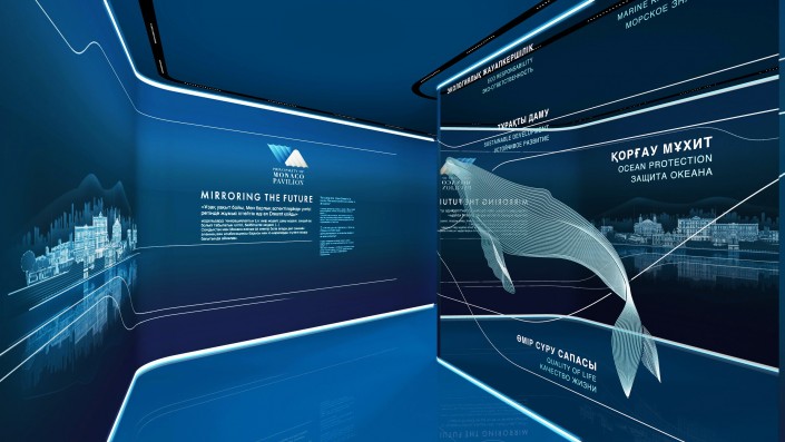 При входе в павильон, стены которого украшены графикой из городского вида Монако и цитатами князя Альбера II, посетители увидят главную инсталляцию секции княжества "Отображение будущего", которая представляет собой кинетическую конструкцию из 17-метровых зеркальных конструкций и будет двигаться как волна и проецировать фильм.