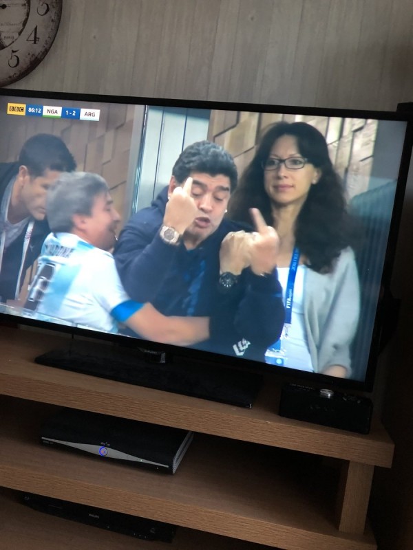 Марадона наблюдал за матчем из VIP-ложи, и во время телетрансляции камеры неоднократно показывали его бурные эмоции и реакцию на происходящее. Футболист вел себя вызывающе и порой неадекватно. Перед игрой Марадона станцевал с болельщицей сборной Нигерии. А после второго гола аргентинцев показал неприличный жест.