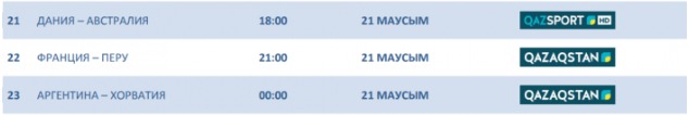 В 18.00 по времени Астаны в Самаре состоится матч группы С между сборными Дании и Австралии. Эту встречу в прямом эфире покажет телеканал QazSport. Онлайн-трансляция.