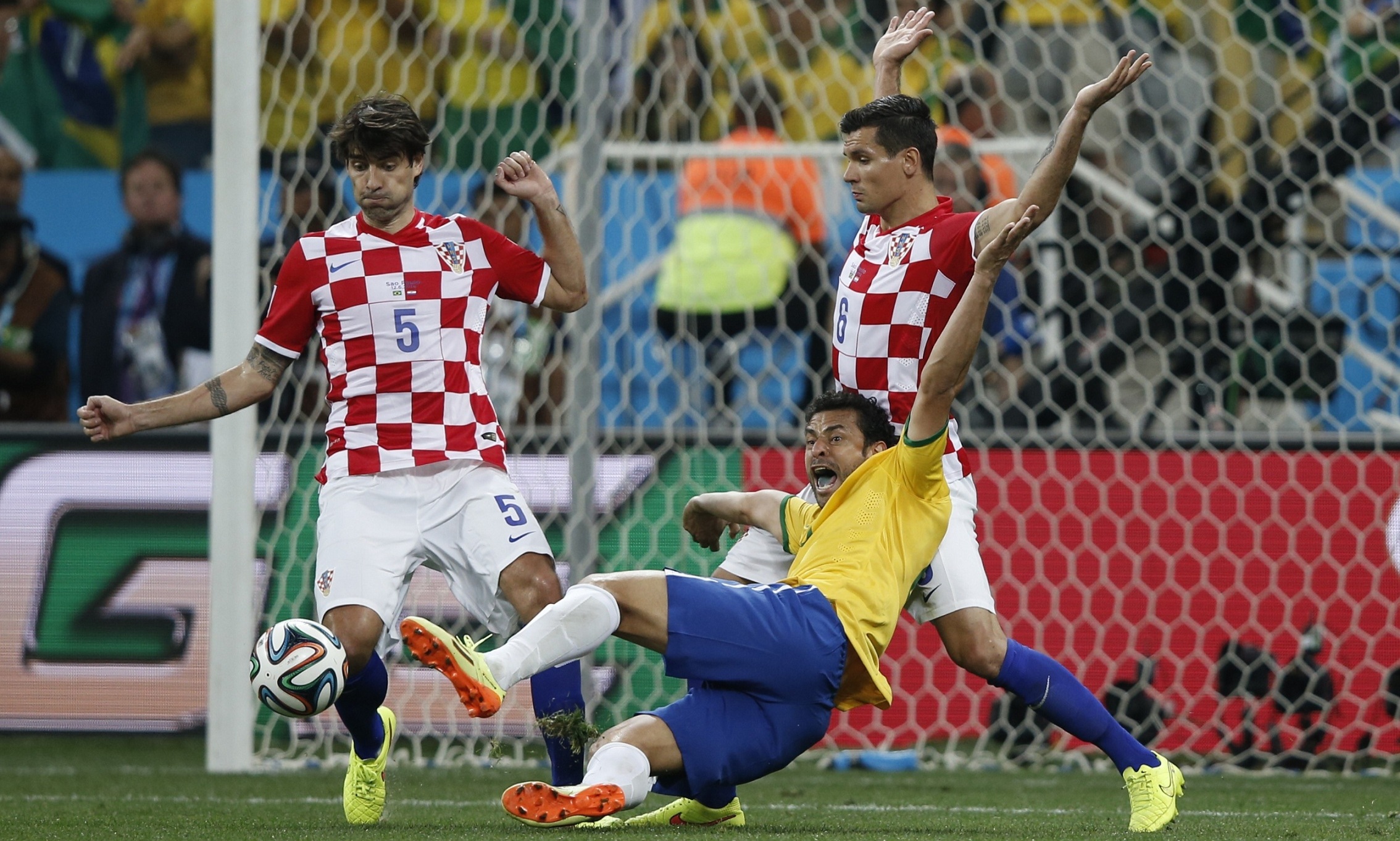 12 июня. В первом матче мундиаля бразильский нападающий Фред картинно падает в штрафной сборной Хорватии.