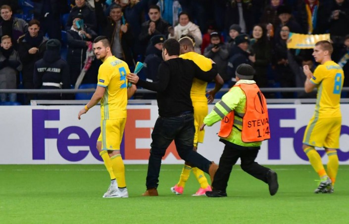 Это случилось на 88-й минуте, когда нападающий Патрик Твумаси забил второй мяч хозяев и установил окончательный счет - 2:3. Сразу четыре фаната пытались прорваться к футболистам "Астаны" и поздравить их с голом, но получилось это не у всех. Уводили нарушителей с поля представители правоохранительных органов.