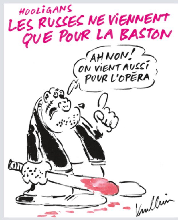 "Хулиганы. Русские приехали только для мордобоя", - гласит подпись к карикатуре. Нарисованный человек при этом добавляет: "О нет. Еще и для оперы".
